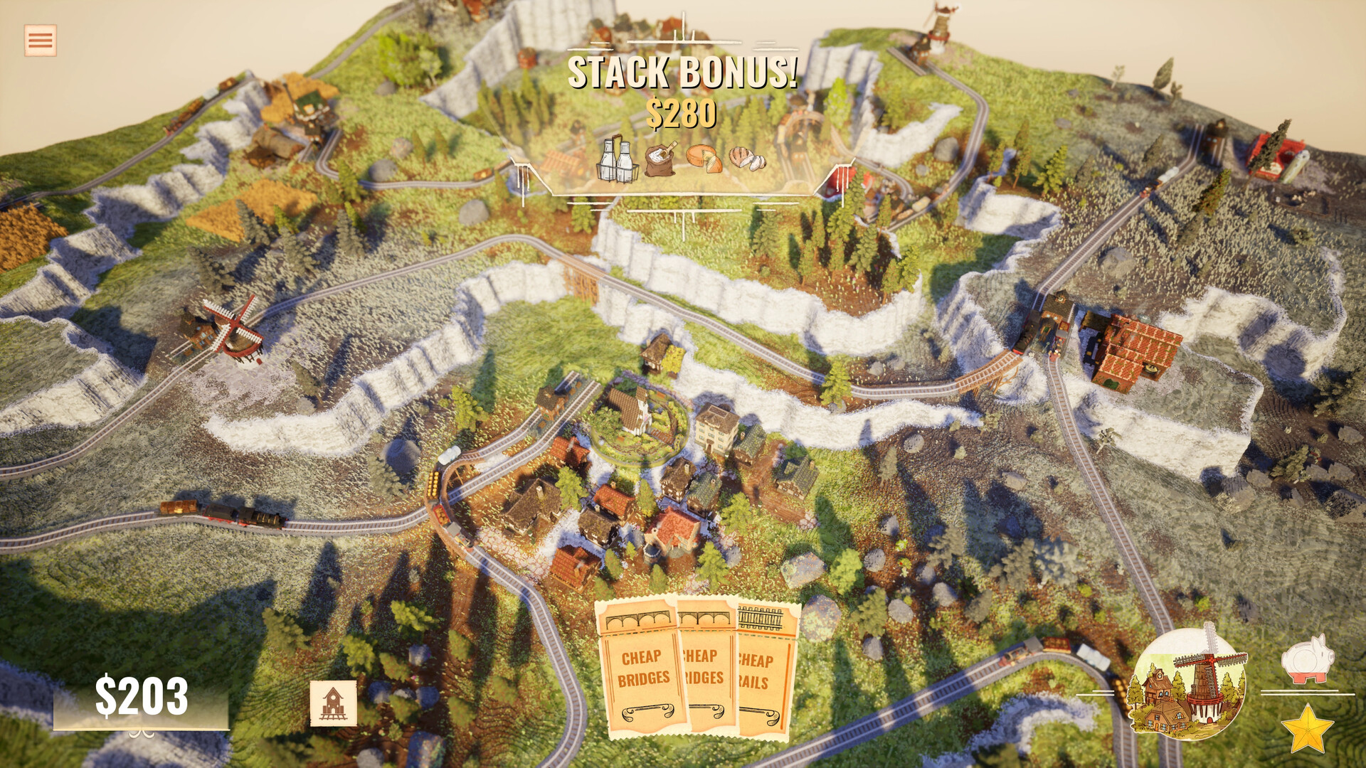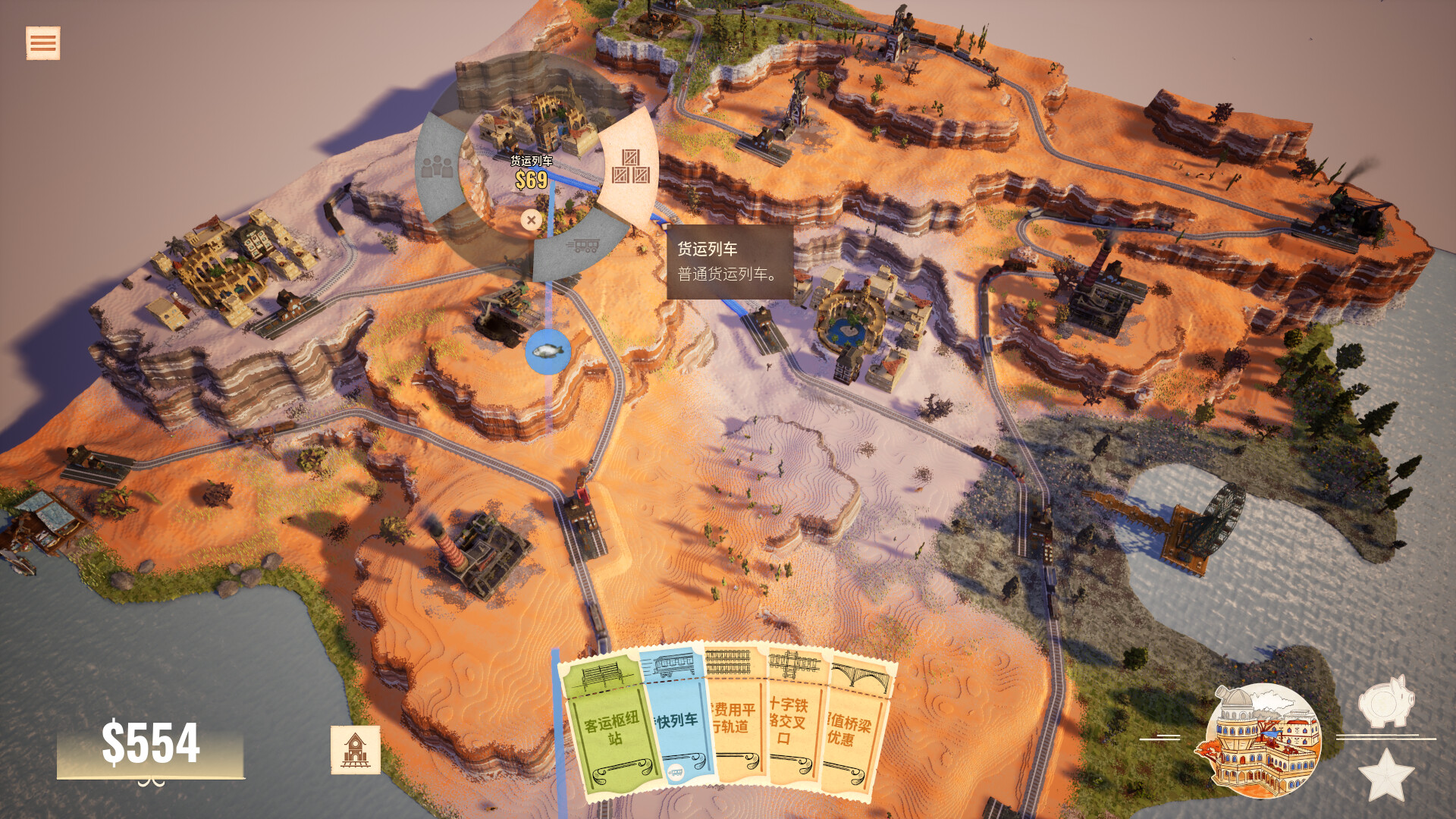 面对寥寥几座乡村建筑,你需要放置车站并连通铁轨,发展壮大你的铁路帝国!
