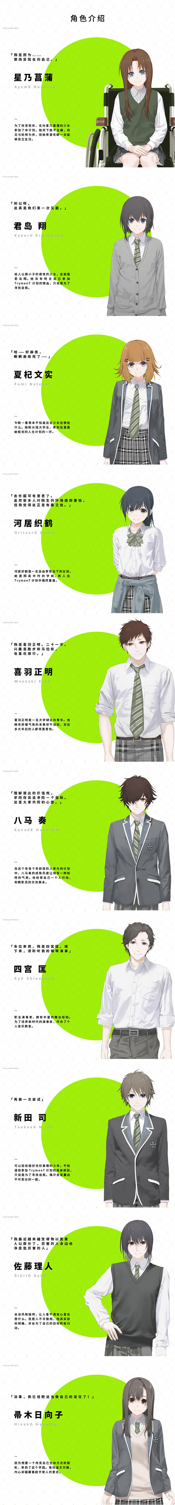 《TrymenT—献给渴望改变的你—》是由2016年被誉为业界年度黑马,并荣获了萌系游戏大赏剧本金奖的作品《Re;LieF~致亲爱的你~》的原班人马所打造的共享世界观与游戏角色,并以群像剧视角重新演绎的全新作品。本作拥有令人一见倾心的顶级场景绘画,以及拥有余音绕梁般魔力的优秀配乐。